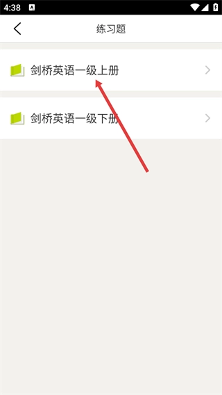 进入练习题页面后,点击【剑桥英语一级上册】选项,就能进入该教材对应的单元练习列表页面。