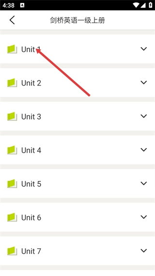 在剑桥英语一级上册的单元列表页面,点击【Unit1】选项,就能进入该单元对应的具体练习题页面。