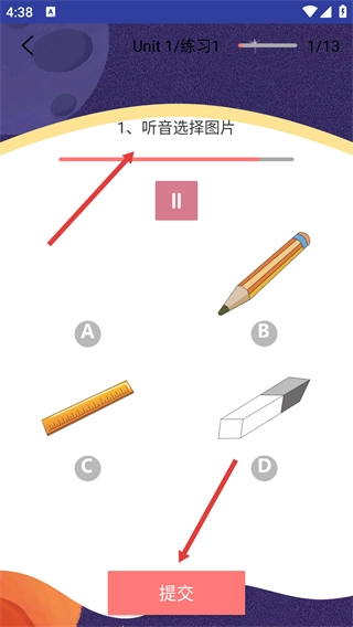 进入Unit1的练习页面后,找到【听音选择图片】类型的题目并进行选择,选好选项后点击【提交】按钮,即可完成该题的作答。