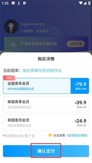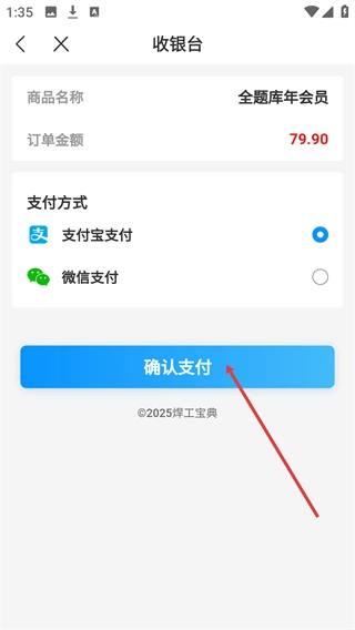 在【购买详情】页面,选定对应的会员类型(例如全题库年会员),接着点击【确认支付】按钮,即可进入收银台界面。