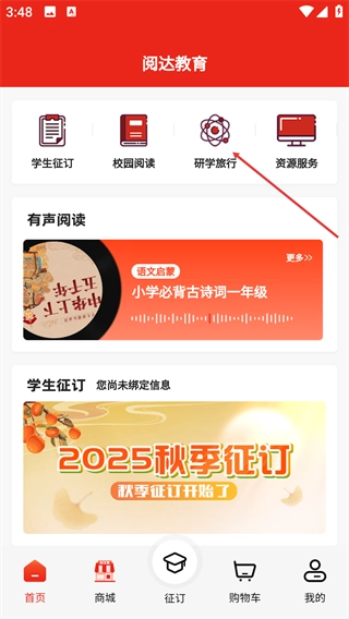 进入阅达教育首页,点击顶部的【研学旅行】选项。