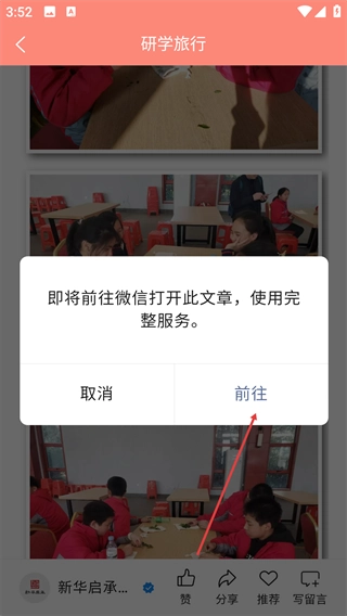当提示框弹出后,点击【前往】按钮,即可跳转到微信端,使用该文章的完整服务。