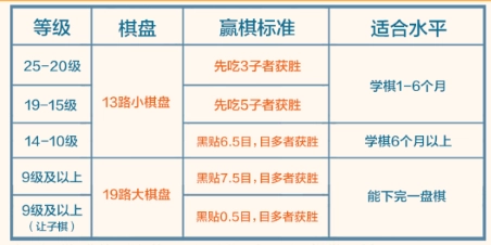 3、19级-15级:双方80手内皆未吃到5子,则为和棋,双方各+5子。