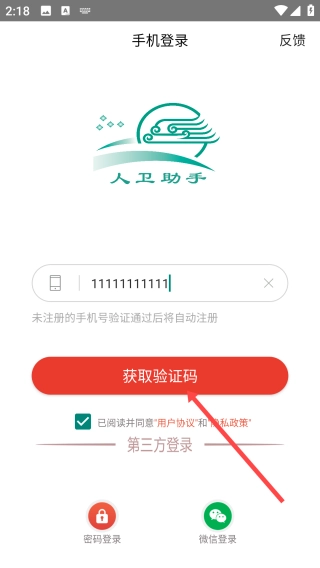 打开人卫助手,点击【请输入手机号】。