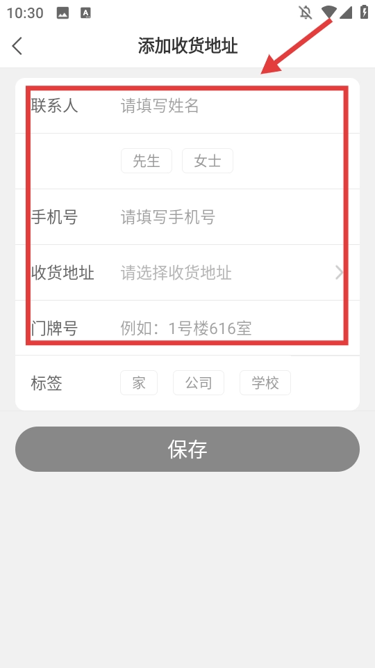 在收货地址添加页面,依次填写联系人姓名、手机号码、具体收货地址以及门牌号等相关信息后,点击【保存】按钮,即可完成收货地址的添加操作。