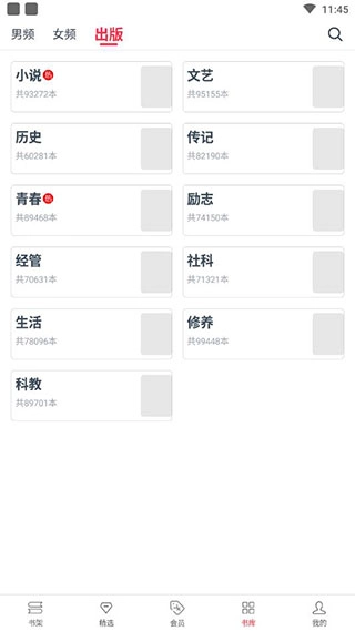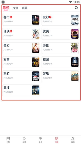 3、书库里能找到各类小说,还会针对男频、女频和出版类分别做介绍,其中男频包含都市、玄幻、仙侠、武侠等类型。