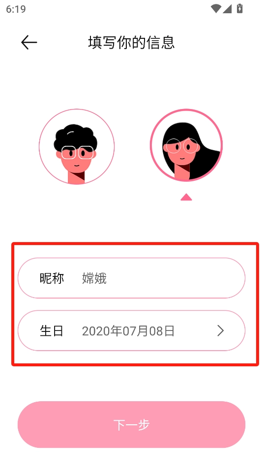 打开后,需填写个人信息,包括昵称与生日,接着点击下一步。