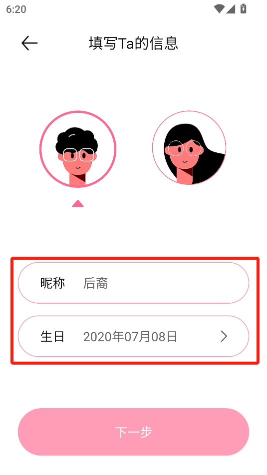 填写对象的信息,昵称和生日,点击下一步。