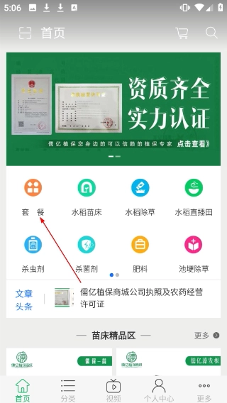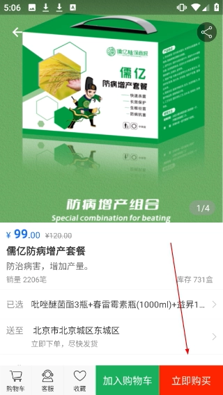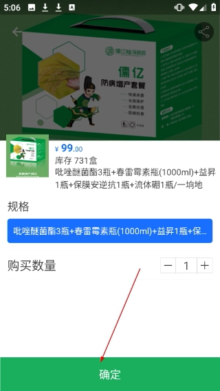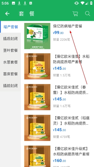 在【套餐】页面找到并点击【儒亿防病增产套餐】这一条目,即可进入该商品的详情页面。