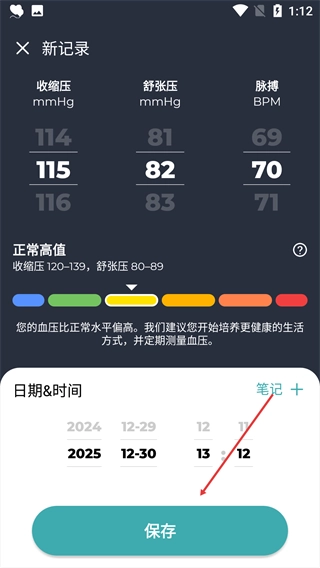 在【新记录】页面,调整并填写收缩压、舒张压、脉搏的数值,完成后点击【保存】按钮。