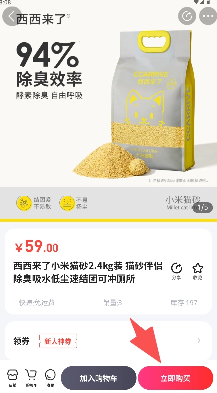 集成了标准电商平台的购物车、商品详情浏览以及在线下单支付等功能。用户选定商品进入详情页面后,点击“立即购买”按钮就能完成下单操作。