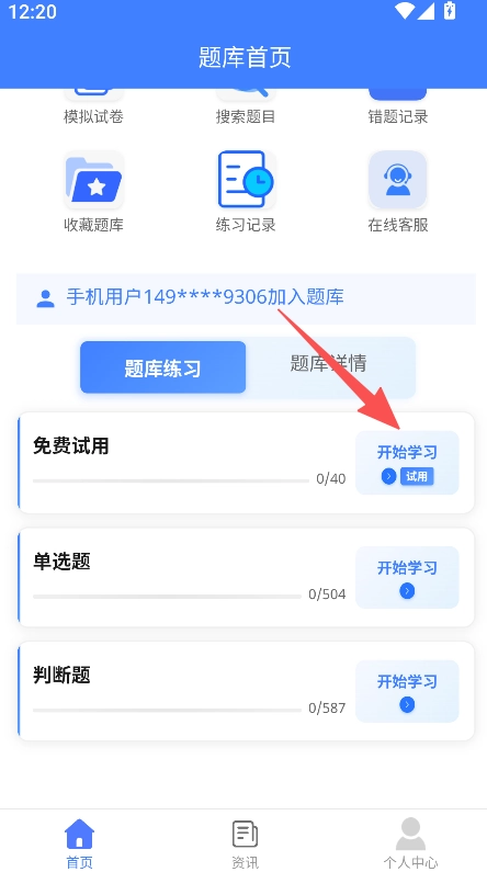 打开软件进入题库首页后,点击免费试用区域的开始学习按钮。