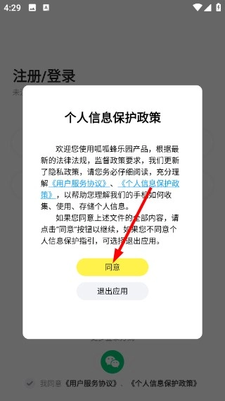 在阅读《个人信息保护政策》并了解《用户服务协议》后,点击弹窗里的“同意”按钮,就能进入注册或登录页面。