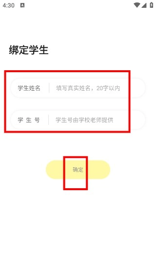 登录后进入【绑定学生】页面,填写【学生姓名】与【学号】信息,点击【确定】按钮即可完成学生绑定操作。