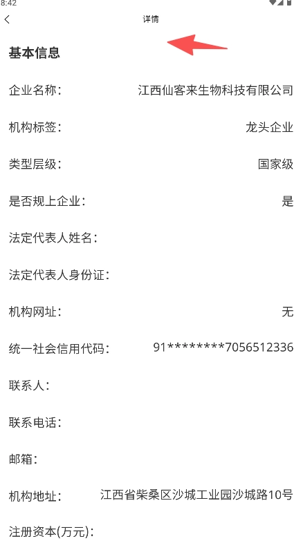 进入具体企业的详情页面,就能查看该企业的层级、信用代码、地址等完整的基本资料。