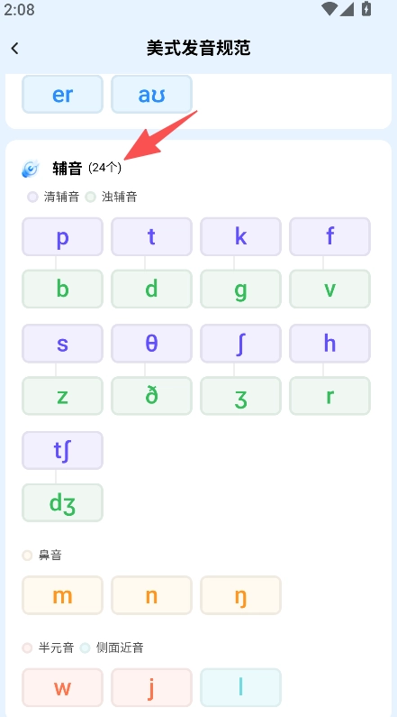音标分类清晰明确,展示辅音等不同类型,便于快速定位对应学习内容,有效提升音标学习效率。