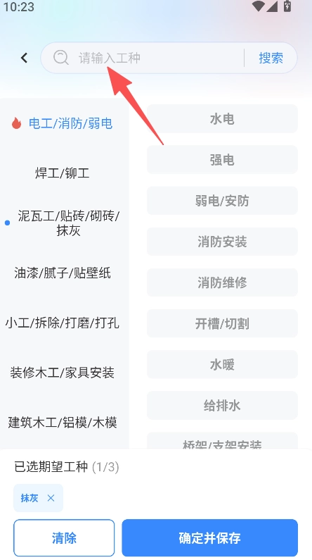 支持工种搜索与选择功能,输入工种后选定期望工种,点击确定并保存完成设置。