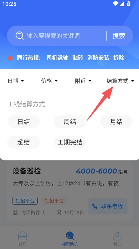 提供结算方式筛选功能,用户可选择对应结算类型,以此缩小招工信息的查找范围。