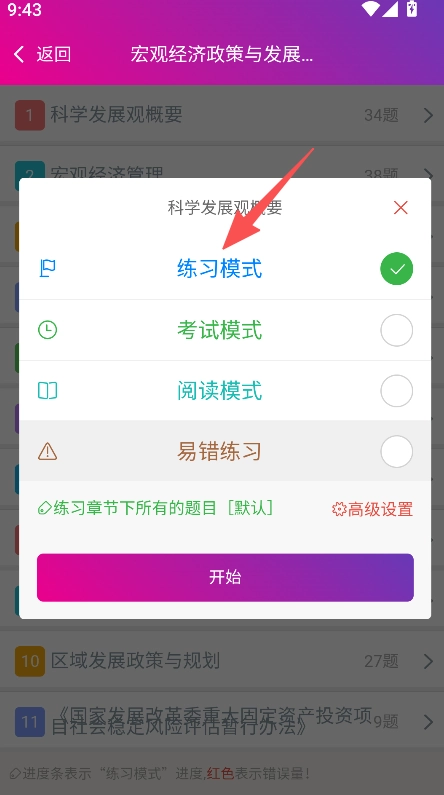 在章节练习页面选择对应内容,弹出模式选择框。