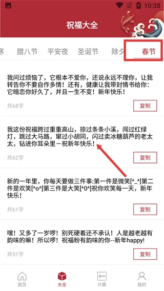 在祝福大全的节日标签栏里,点击“春节”标签,就能切换显示春节相关的祝福语列表。