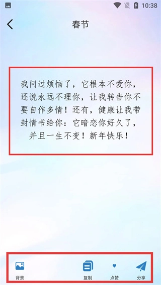 挑选一条春节祝福语进入详情页面,就能借助底部的复制、分享等功能,使用这条春节祝福内容。