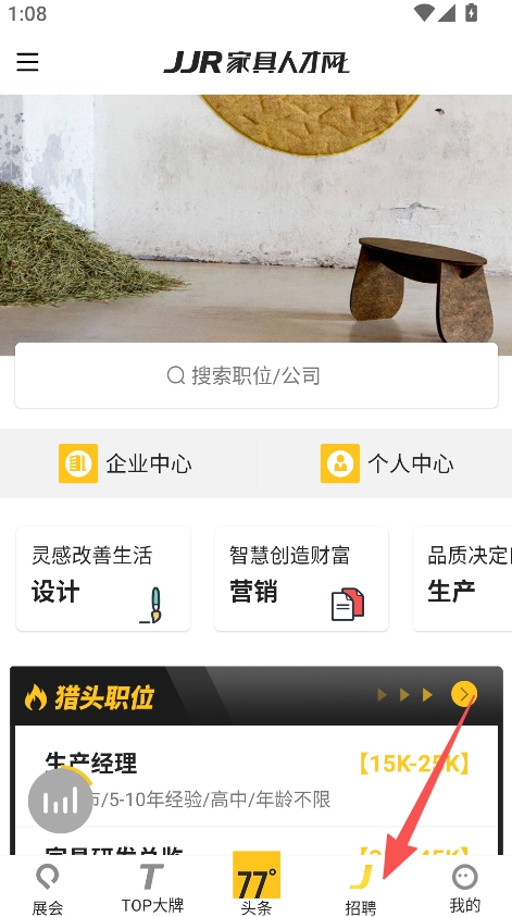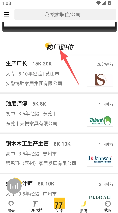 拥有职位搜索功能,点击搜索框并输入关键词,即可查找家具行业的相关职位或企业信息。