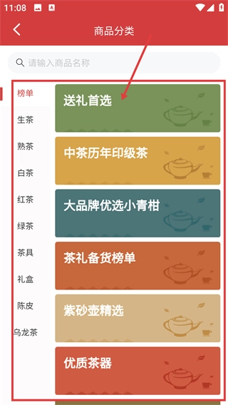 进入商品分类页面后,点击【送礼首选】这个分类选项,就能浏览到该类别下的茶叶推荐榜单,轻松找到适合送礼的优质茶叶啦。