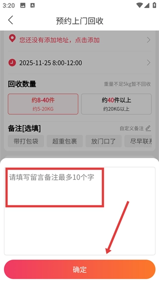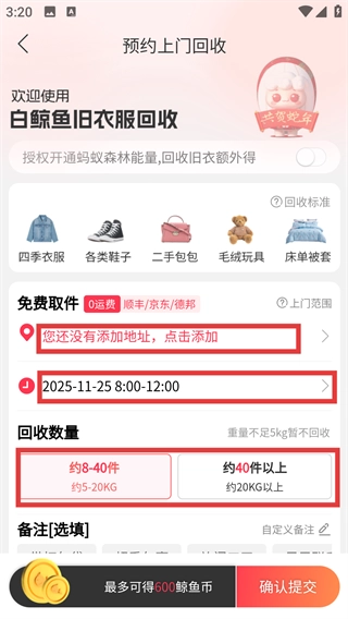 在预约上门回收的页面,我们需要添加地址,选择回收的时间和数量(例如8到40件),这样就能继续后续操作啦。