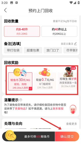 最后我们选定回收奖励的类型,像鲸鱼币、现金或者公益捐学费都可以,选好之后点击【确认提交】按钮,这样就完成回收预约了。
