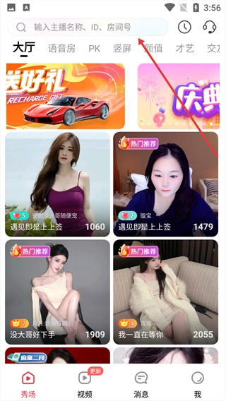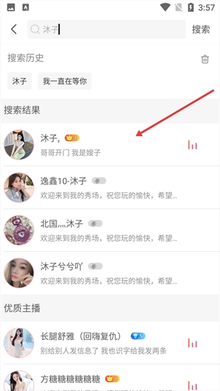 在顶部的搜索栏,输入主播名称,进行搜索。