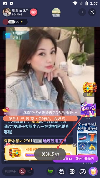 完成对该主播的关注操作后,页面将会弹出“关注成功”的提示信息。