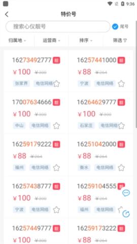 用户可以在软件内选择运营商、归属地等条件进行筛选,查看符合要求的靓号列表。选择心仪的靓号后,点击购买并按照提示完成支付即可。