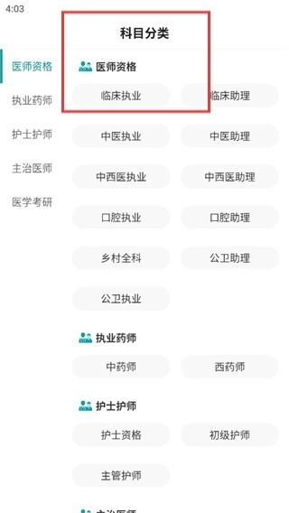 在【科目分类】里挑选相应的考试类别(像医师资格这类)。