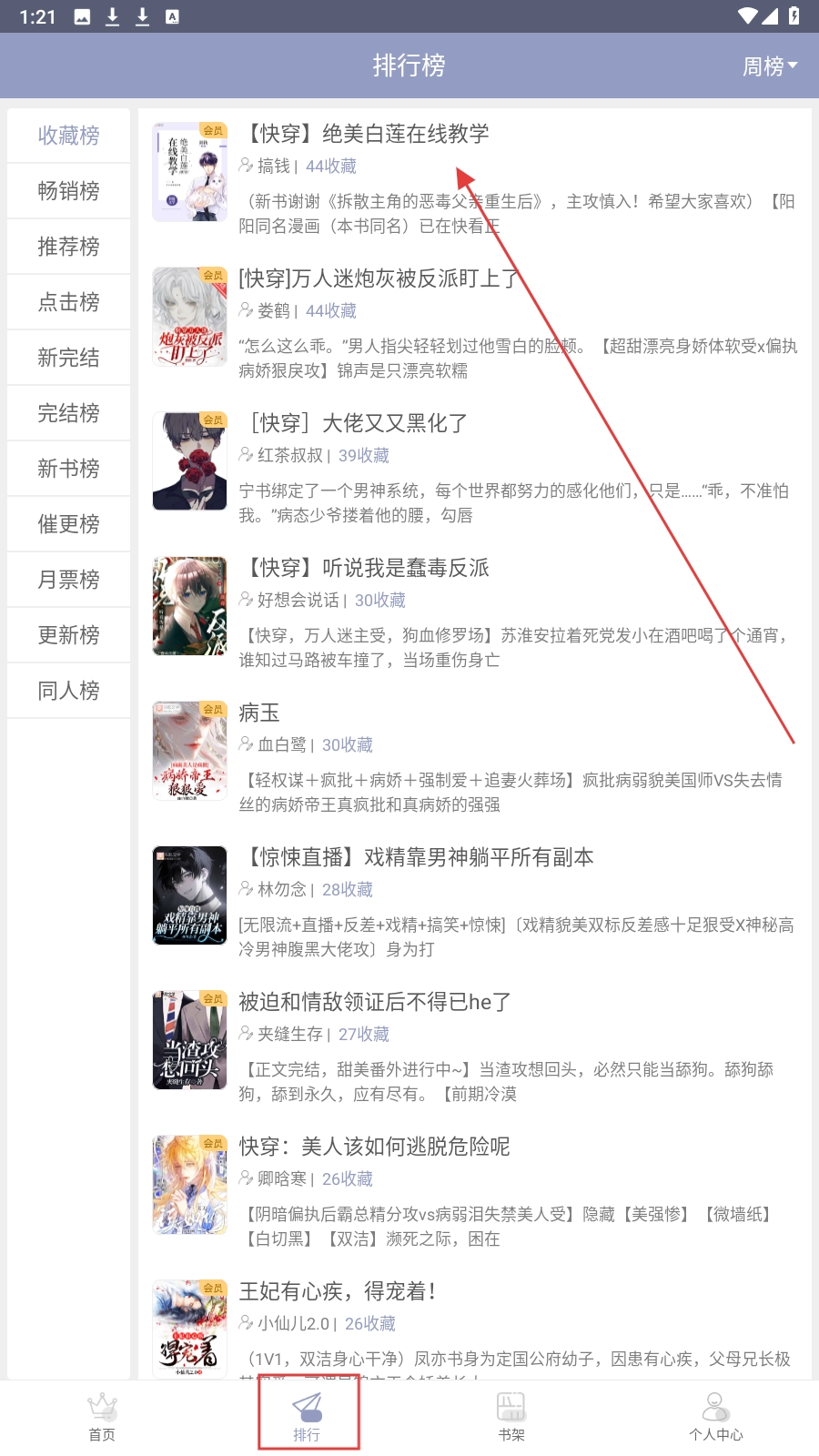 打开应用后进入排行页面,选择一本感兴趣的小说(比如《绝美白莲在线教学》),点击进入该小说的详情页。