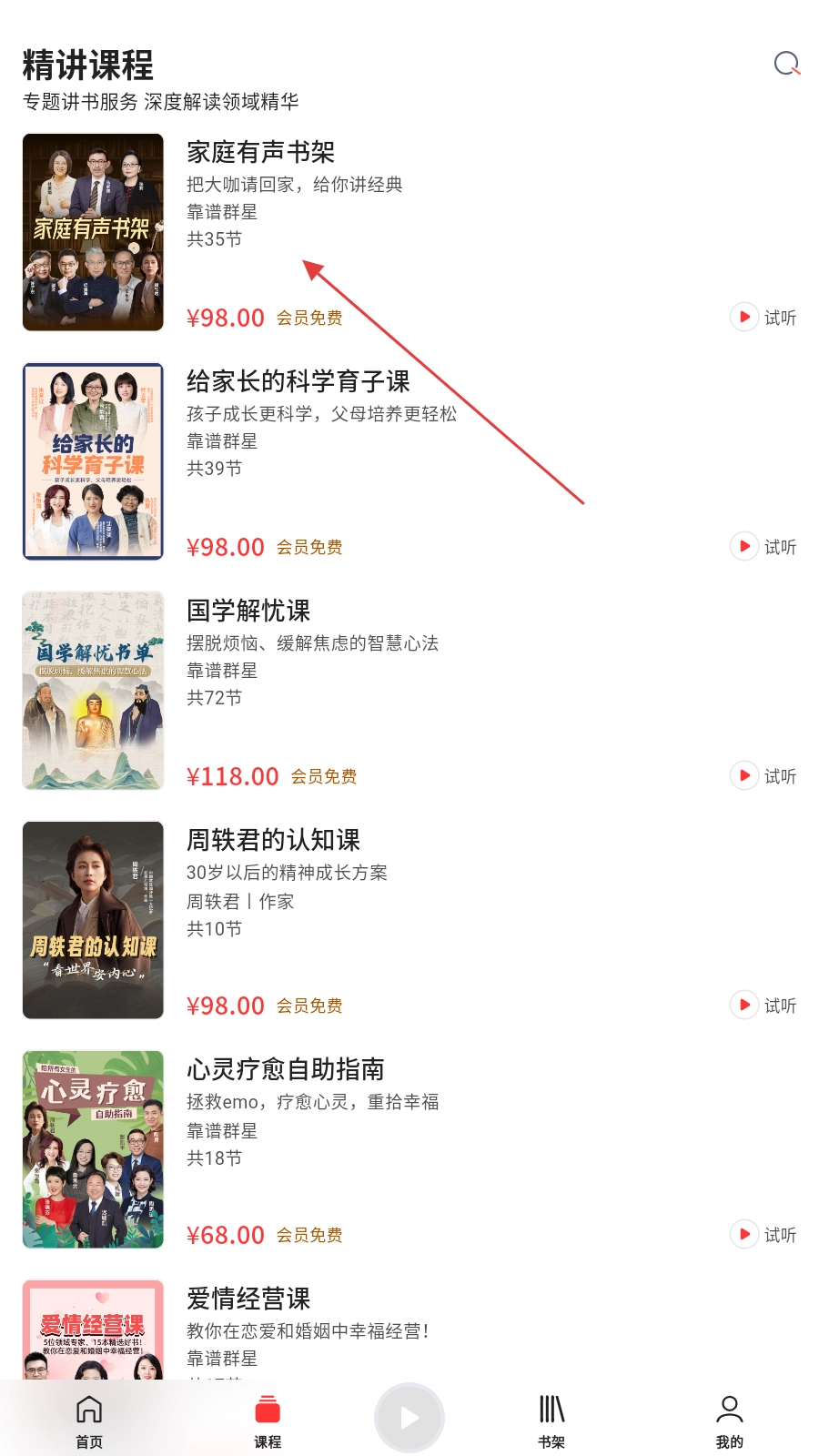 在课程页面,找到并点击【家庭有声书架】这一课程条目,即可进入对应的课程详情页。