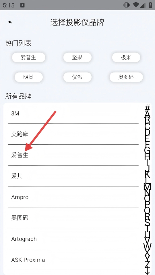 在挑选投影仪品牌的页面,依据实际状况选定对应的品牌,点击进入遥控器配对页面。