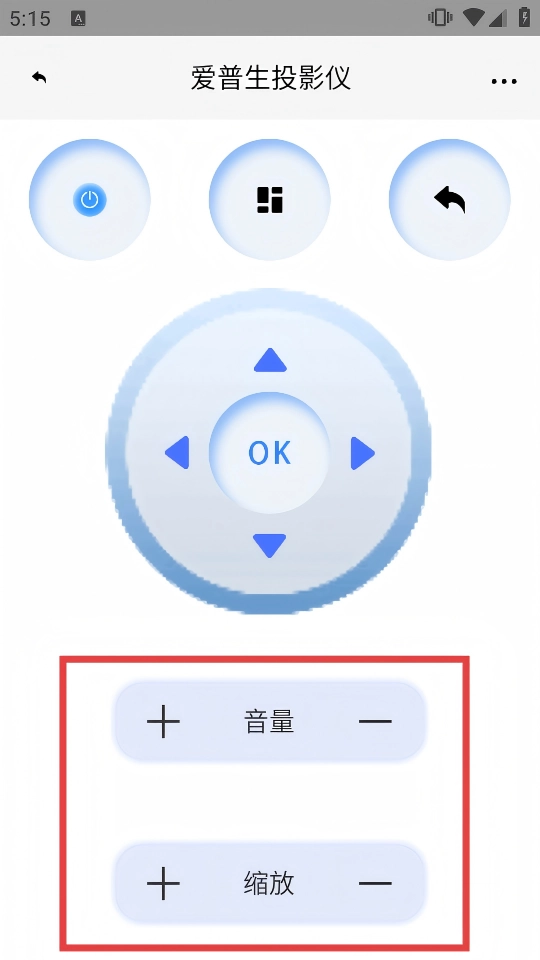 配对成功后,即可进入爱普生投影仪的遥控界面,在该界面中,您可以利用【音量±】按钮来调整音量大小,也能通过【缩放±】按钮对画面的缩放比例进行调节。