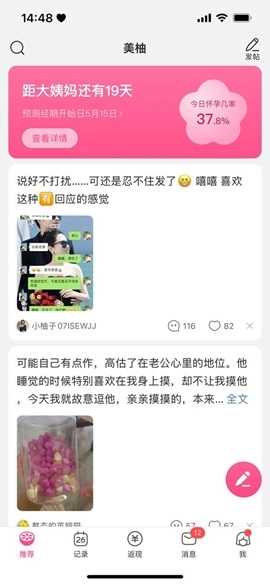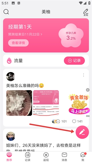 我们在美柚的推荐页面,点击右下角那个粉色的发帖笔图标,就进入到发帖子的编辑界面了。