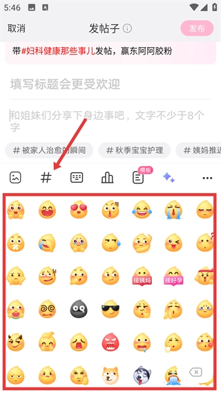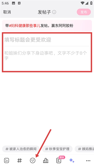 在发帖页面,我们可以填写标题和分享内容,另外点击底部的表情图标,还能给帖子增加一些趣味呢。