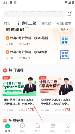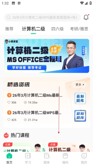 在计算机二级页面向下滑动,就能查看这个分类下的热门课程内容。