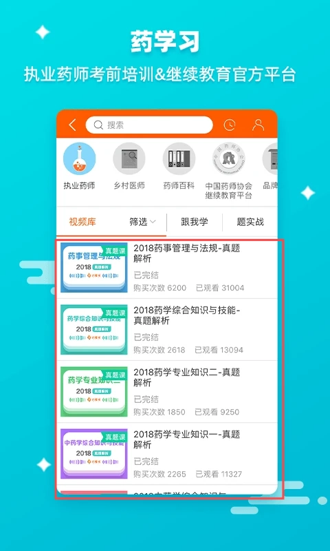 海量学习资源:海量执业药师学习视频,权威名师线上传道授业,配备在线考试,随时自测提升。