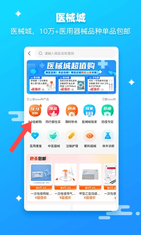 在顶部的搜索栏里搜索【药器械】,就能找到各种各样的器械,还有超值的秒杀价商品以及9.9元包邮的实惠器械。