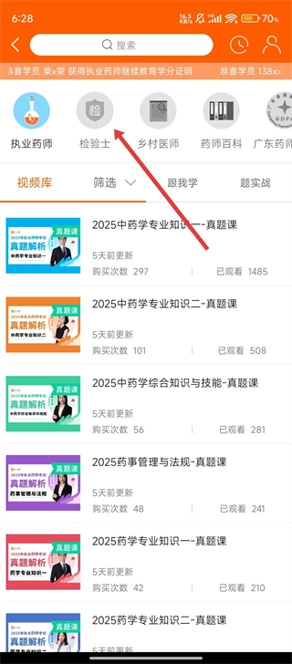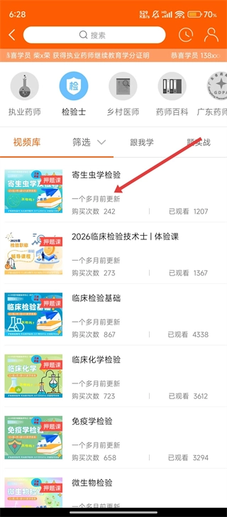 在药学习板块里,点击【检验士】这个分类,就可以找到检验士相关的课程资源啦。