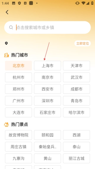 在城市管理页面,点击【添加城市】按钮,即可进入城市选择页面。