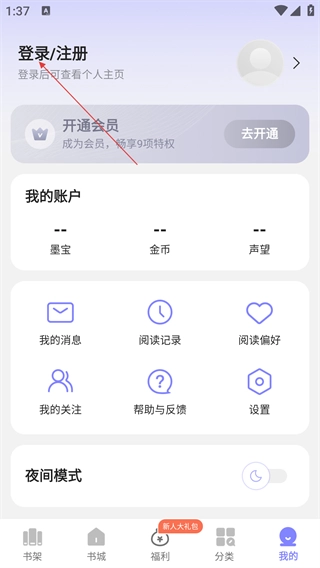 打开贤读小说应用后,点击底部导航栏中的【我的】选项,进入个人中心页面,在该页面可以看到登录入口、账户相关功能入口等内容。