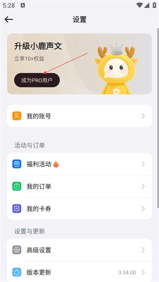 在设置界面中,点击【成为PRO用户】按钮,即可进入小鹿声文PRO会员的订阅页面。