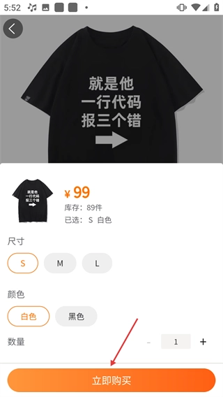 在规格选择页面确定好尺寸、颜色和数量后,点击【立即购买】按钮。