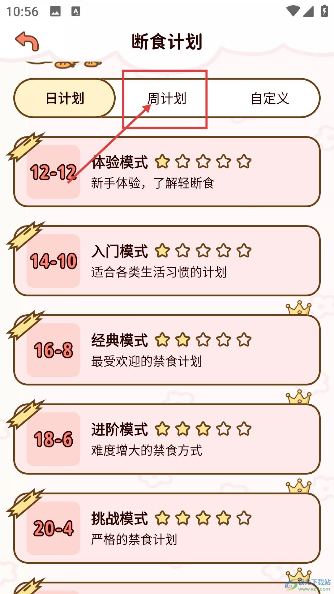 进入断食计划界面后,选择【周计划】选项,就能看到适合一周周期的断食模式,像入门、经典这类模式都包含在内。