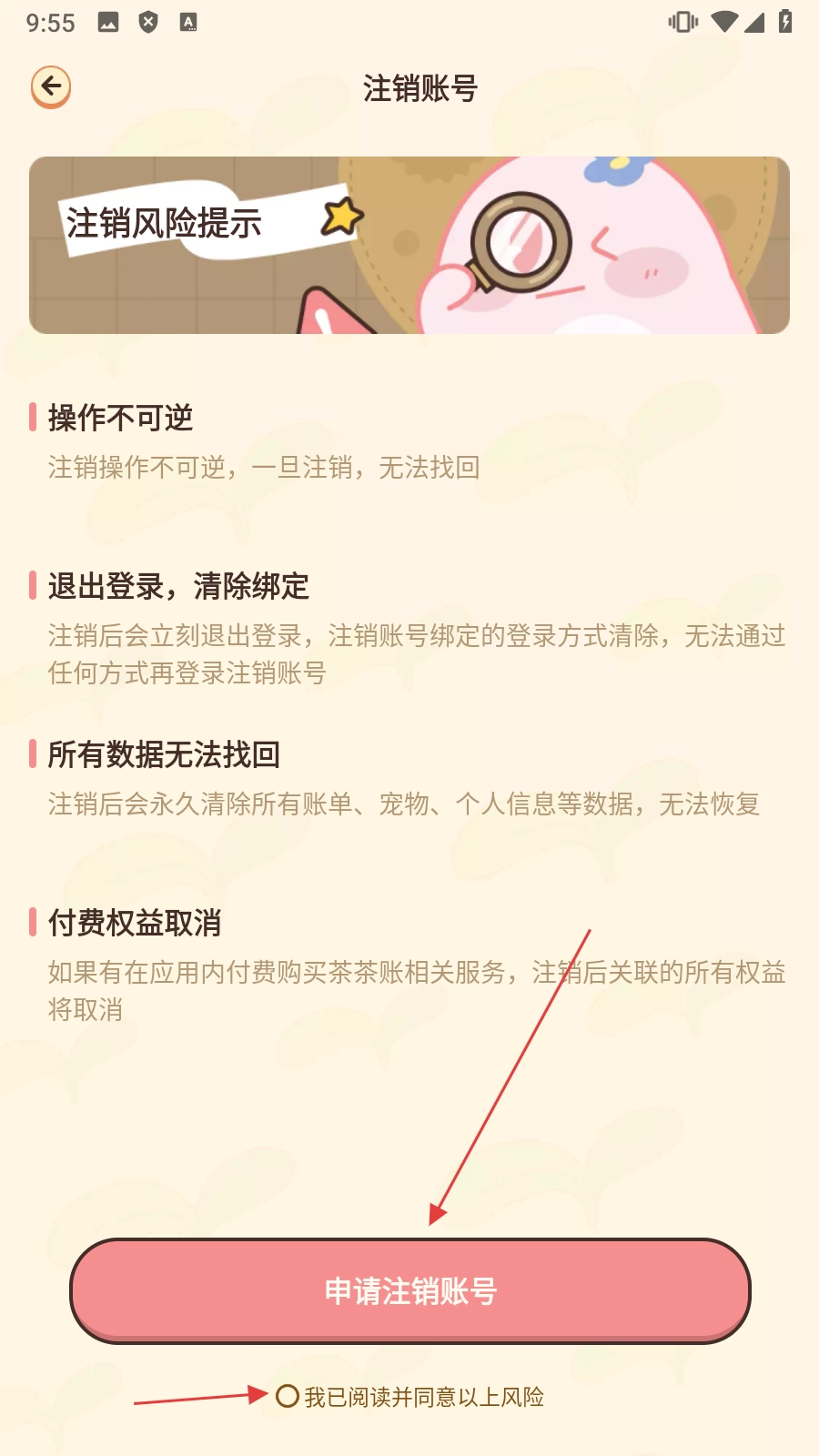 在提示页面勾选同意后,点击【申请注销账号】按钮,就能完成账号注销流程。