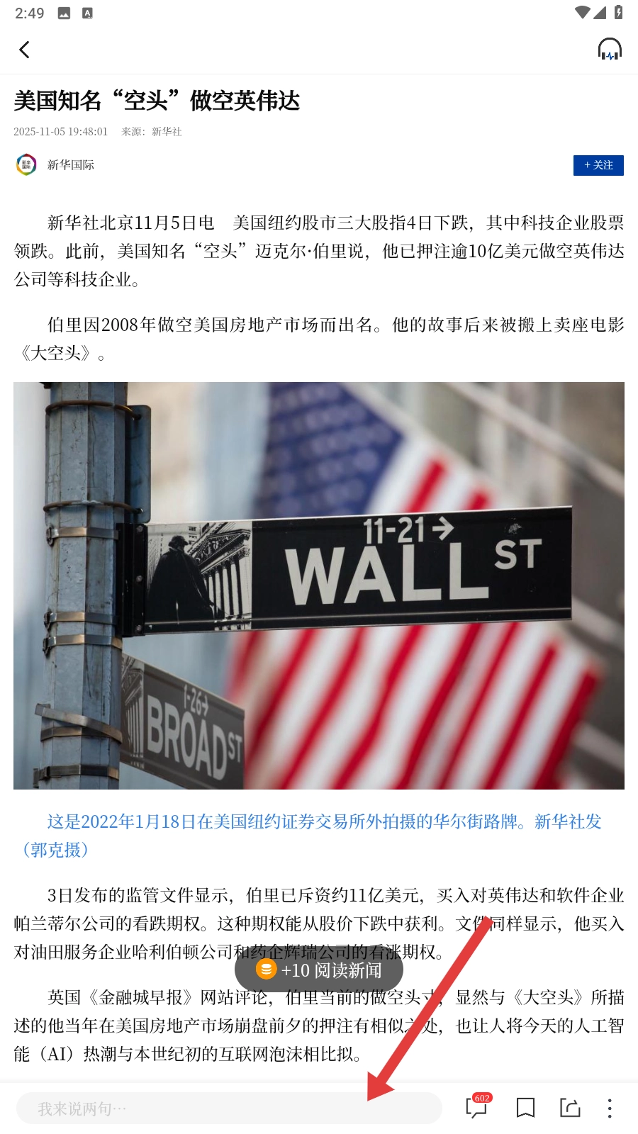在国际新闻板块,点击你感兴趣的新闻标题,比如《美国知名“空头”做空英伟达》,就能进入新闻详情页面了。